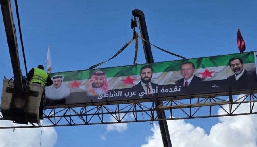 Ziyaretin adı konmamış ama sonucu Kürtlere topyekûn imha ve katliamdır. Şara’nın yanında Saddam ve Erdoğan resimleri!